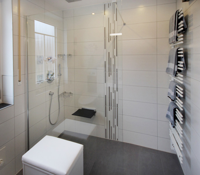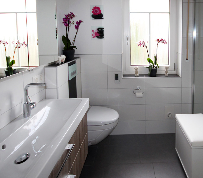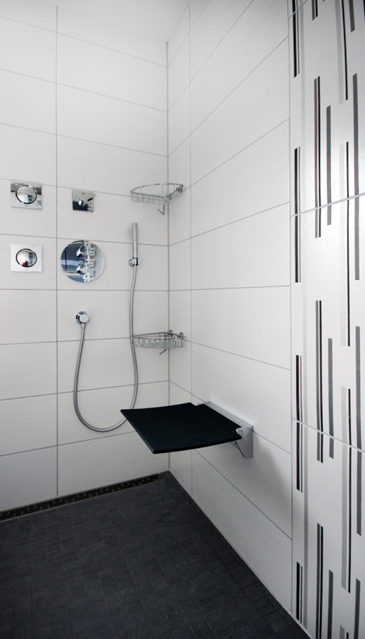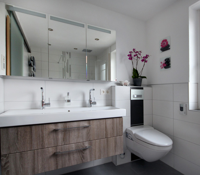 Das Badezimmer einer Pegnitzer Familie wurde im Juni 2013 komplett saniert. Highlihts im Badezimmer sind das Dusch-WC von Geberit sowie die Seiten-und Deckenbrausen im Duschbereich. Aus Platzgründen wurde auf die normale Zimmertür verzichtet. Dafür kam eine perfekt integrierte Schiebetür zur Ausführung. Weiterhin kamen Einbaustrahler in die abgehängte Decke, die das sehr gelungene Bad immer im richtigen Licht erscheinen lassen. Abgerundet wurde die Elektroinstallation mit einer Radioanlage die in der Schalterleiste mit integriert ist.