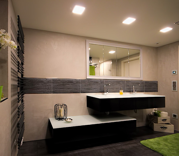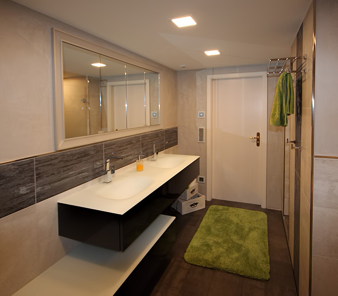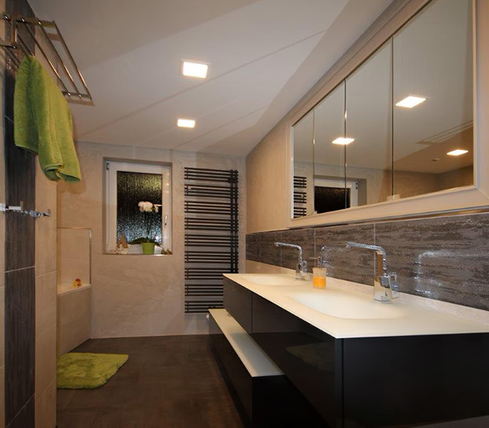 Im Frühjahr 2016 führten wir die Badsanierung in Pegnitz einschließlich aller erforderlichen Nebenarbeiten durch. Das bestehende kleine Badezimmer wurde um 4,5 qm erweitert. So entstand die gewünschte, großzügige begehbare Dusche, mit Decken- und Seitenbrausen. Die Badewanne wurde mit speziellem Lichtsystem ausgewählt. Als Beleuchtung haben wir superflache LED-Lampen ausgesucht. Das WLAN-Radio mit zusätzlichen Lautsprechern in der Decke liefert dazu den passenden Sound. Der große Einbauspiegelschrank rundet das rundum gelungene Badezimmer perfekt ab.