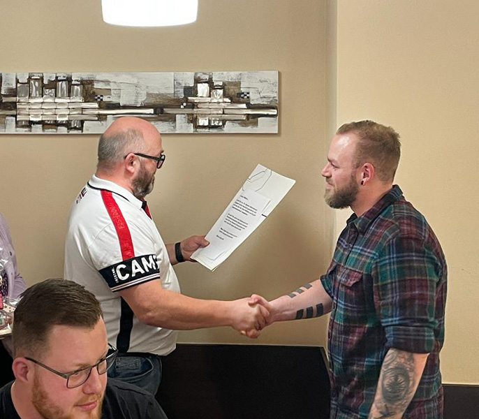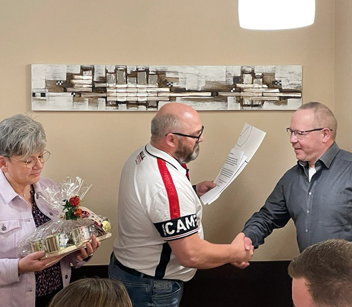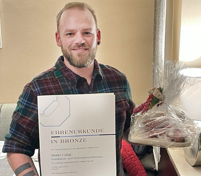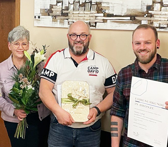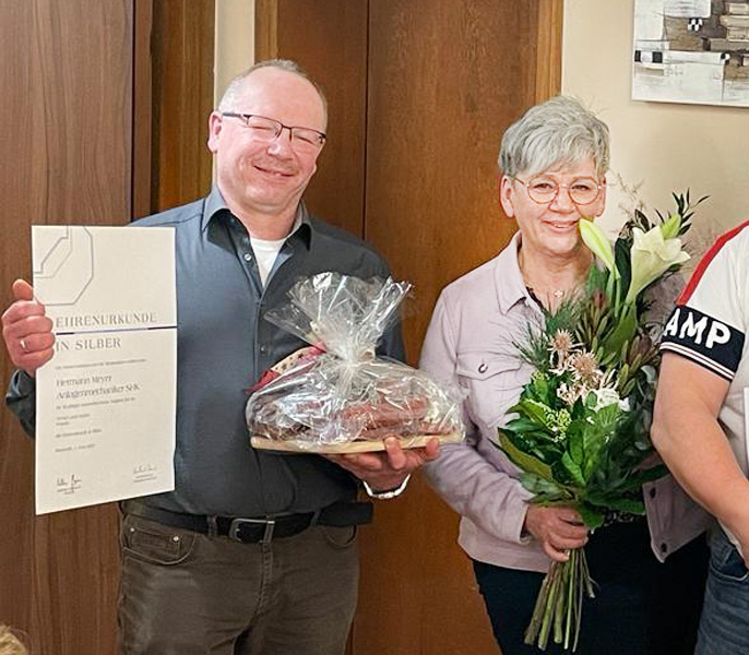 Als weiteren Mitarbeiter konnte Georg Lang seinen Kundendienstleiter Hermann Meyer für 25 Jahre ununterbrochene Tätigkeit in seiner Firma ehren: „Hermann ist seit vielen Jahren aus unserer Firma nicht mehr wegzudenken! Er leitet den gesamten Kundendienstbereich mit Ruhe und Besonnenheit und hat Nerven wie ein Stahlseil.“