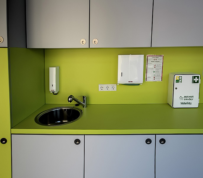 Im April 2014 wurde die Kindertagesstätte „Sonnenhügel“ in der Flurstraße in Zirndorf bei Fürth in Betrieb genommen. Wir von Lang installierten in der KiTa die Sanitäranlage. Zur Ausführungen kamen — verursacht durch den besonderen Umstand, dass der gesamte Keller unter der Rückstauebene liegt — verschiedene Hebeanlagen, die das Abwasser durch die Rohrleitungen pumpen.
