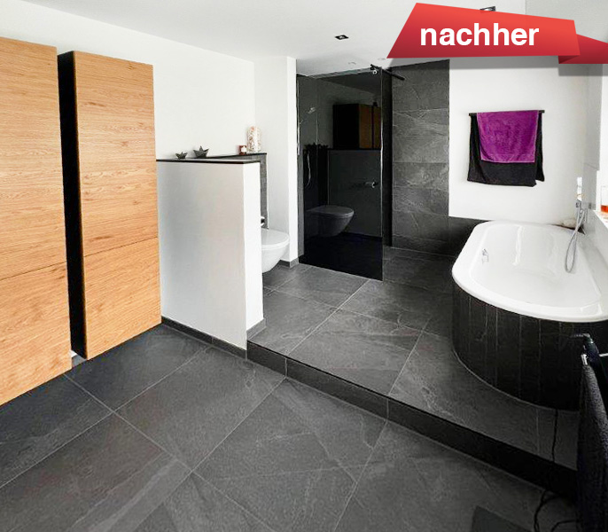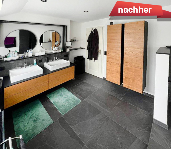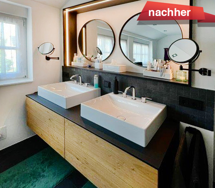 Im Frühjahr 2024 haben wir bei einem unserer langjährigsten Kunden eine komplette Badsanierung durchgeführt. In dessen Badezimmer wurden — wie bei allen unseren Sanierungen — bestehende Be- und Entwässerungsleitungen komplett erneuert. Zur Bedienung des Wasserlaufs hat sich unser Kunde die wunderschönen Eingriff-Armaturen der Firma Duravit (Modell C1) ausgesucht. Sämtliche Bademöbel wurden vom mittelfränkischen Badmöbelhersteller Heibad aus Heideck gefertigt. Wir wünschen unserem Kunden viel Spaß mit seiner neuen Wellness-Oase!
